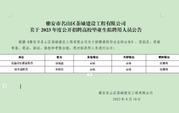 雅安市名山區(qū)茶城建設(shè)工程有限公司系雅安市名山區(qū)區(qū)屬一級國有企業(yè),成立于2018年,注冊資本2億元,主要經(jīng)營范圍為對土地、城市資源等領(lǐng)域及保障性住房、房地產(chǎn)開發(fā)、城市基礎(chǔ)設(shè)施、公共服務(wù)設(shè)施等進行經(jīng)營管理;并開展項目投資、工程管理服務(wù)及園林綠化、環(huán)境治理、土地整理等各類工程建設(shè)活動。根據(jù)公司2022年人員招聘計劃,茶城公司及全資子公司擬面向社會公開招聘高校畢業(yè)生3名(含2020年、2021年未就業(yè)高校畢業(yè)生和2022年應(yīng)屆高校畢業(yè)生。特別說明:“未就業(yè)高校畢業(yè)生”需同時滿足以下條件:拿到畢業(yè)證和學(xué)位證;在規(guī)定擇業(yè)期內(nèi)沒有與任何單位簽訂任何形式的勞動合同...